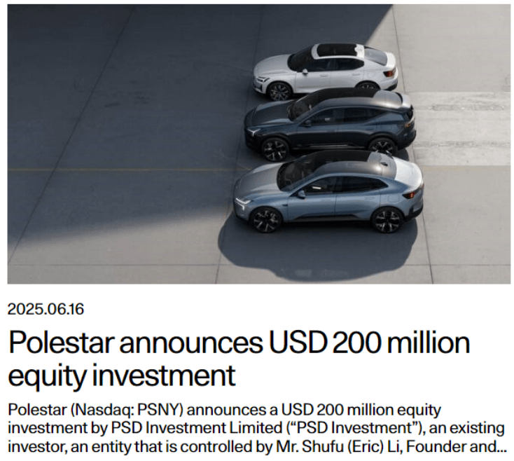第一电动6月18日消息,极星汽车宣布获得现有投资人PSD Investment Limited的2亿美元股权投资,约合14.38亿元人民币。PSD Investment Limited由吉利控股集团创始人兼董事长李书福实际控制,此次交易后,李书福将通过PSD投资和吉利的瑞典子公司持有极星66%的股份,沃尔沃汽车在极星的股份从18%减少到16%。
