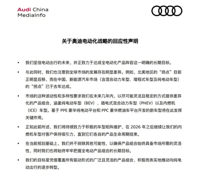 奥迪计划在2026年之后继续让内燃机车型对客户保持吸引力,直到它们各自的产品生命周期结束。公司并不排除其他可能性,以确保产品组合始终具备市场所需的灵活性,同时牢牢把握全电动产品组合的长期目标。奥迪的目标是凭借覆盖所有驱动形式的广泛且灵活的产品组合,积极而务实地推动向纯电动出行的逐步转型。