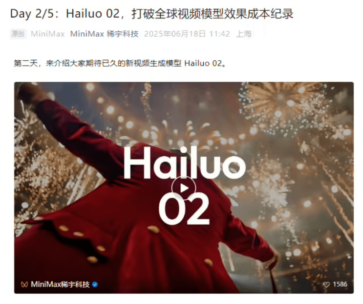 MiniMax表示,新模型可以完整响应复杂指令,提供更好的反馈,并且创作者可以用相对实惠的价格生成原生1080p视频。Hailuo 02目前提供三个版本:768p-6s、768p-10s和1080p-6s,其价格在国内外市场都具有优势。此外,MiniMax计划在未来继续提升生成速度、偏好对齐和高阶功能的实现。同时,据澎湃新闻消息,MiniMax正考虑在香港进行首次公开募股(IPO),目前处于初步筹备阶段。MiniMax成立于2021年,2024年3月获6亿美元A轮融资,投后估值25亿美元,由阿里巴巴领投,此前投资方包括腾讯等。