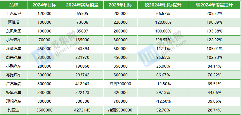 不过极氪汽车、理想汽车一改过去的激进,对2025年的增量目标持相对保守态度,预计分别较2024年实际销量增长44.06%、39.86%。