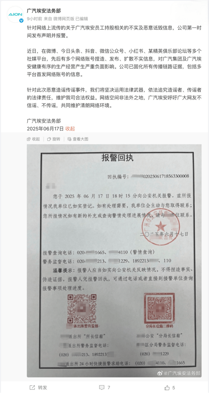 第一电动6月18日消息,广汽埃安法务部官微发布声明,针对网络上流传的关于广汽埃安员工持股相关的不实及恶意诋毁信息,公司已第一时间发布声明并报警。声明中提到,在微博、今日头条、抖音、微信公众号、小红书等多个社媒平台,有多个网络账号捏造、发布、扩散不实信息,对广汽集团及广汽埃安的生产经营产生严重负面影响。公司已固化所有传播链路证据,包括多平台首发网络账号的信息,并坚决运用法律武器,依法追究造谣者、传谣者的法律责任,维护公司合法权益。